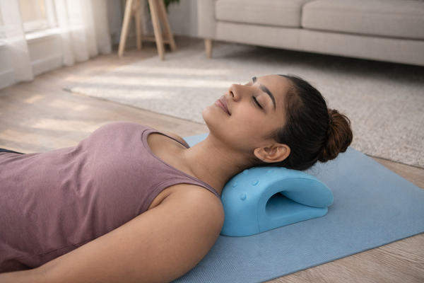 Place NeuroRest on a flat, firm surface such as a yoga mat or carpeted floor. The curved side faces up, ready to support your neck.